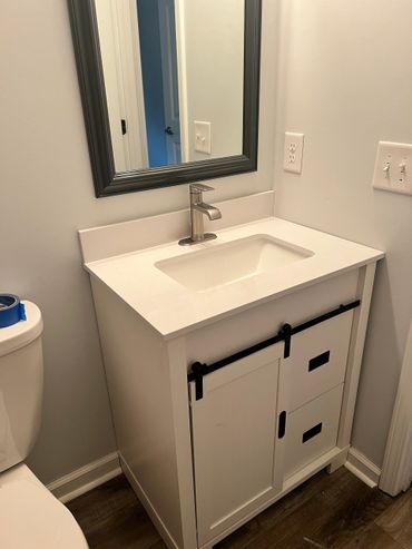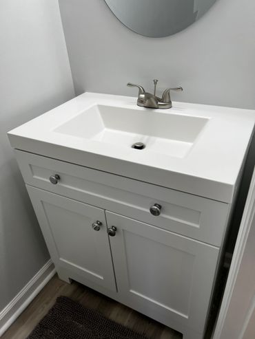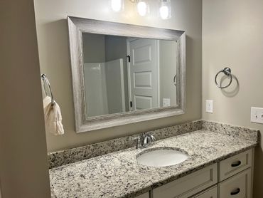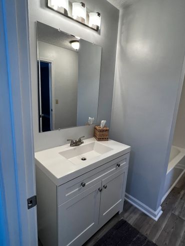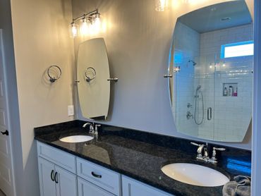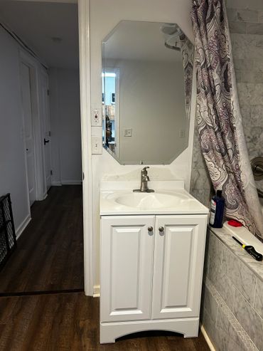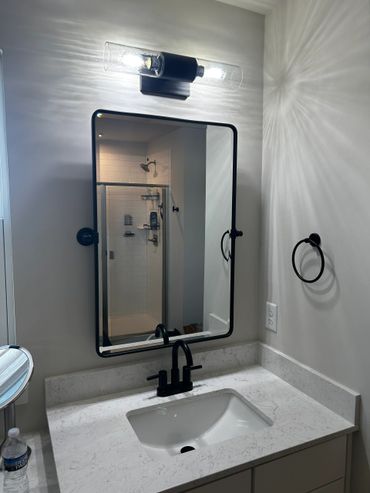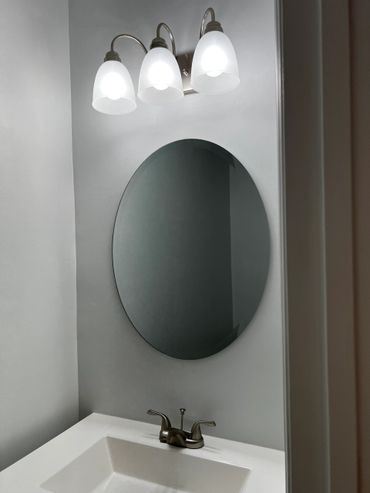 We can install new vanities, faucets, light fixtures, towel bars, toilet paper holders, towel rings, robe hooks, new toilets, shower curtains & rods, vent fans, and hang new mirrors.