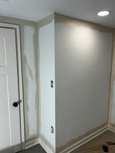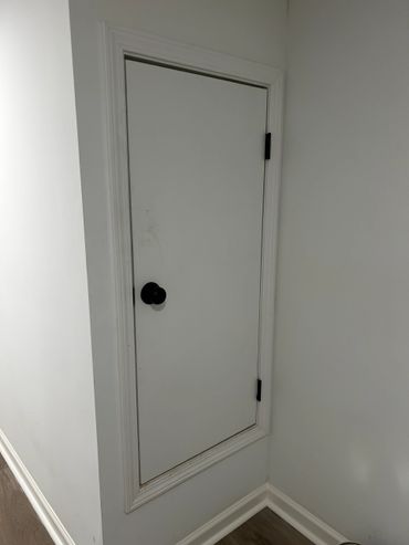 The painting continued at Lisa's house last week with the completion of the Master Bathroom downstairs, as well as the stairs and hallway. Lisa also wanted me to do something with the her 3 different access doors downstairs as well. The week before I installed new door hardware on her water heater access door. This past week I eliminated the small sump pump access door & trim, and replaced it with a paintable flush panel. After I repaired and finished the wall around the opening. She was also unhappy with the crawl space access door which is right in the middle of the bedroom above the wall bump out. She plans to place decorative items there, so she wanted a door that was more discrete, and flush with the wall. I removed the casing around it, skimmed 2 coats of drywall mud around the perimeter (sanding in between coats), and used a nice piece of 3/4" sanded plywood to create a new cabinet style door. Then used a set of soft close recessed cabinet hinges. After that I painted the door & wall around it, then a recessed pull knob.