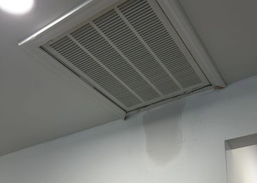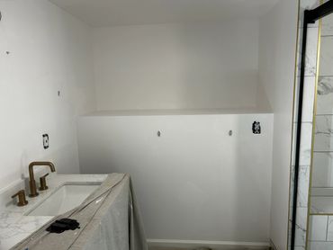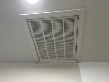 Also pictured here is the shortened bed frame/headboard that I cut down the week before for my client Lisa at her house in Old Hickory. She wanted it to sit with the headboard just below the window casing, so I need to cut out 7 inches from the main support legs. Which I then mended back together using 1/2" wooden dowels through the center with plenty of wood glue, and then added mending braces in the back. I also replaced a piece of trim around the air return that I had to remove when I relocated her thermostat. I then filled and caulked the trim piece before painting it. Lisa also asked me to fill the gaps in certain areas below the door casings & jambs. I also cleaned up old paint splatter from her Guest Bathroom tile floor that was left by the original painters using a special paint removal product.
