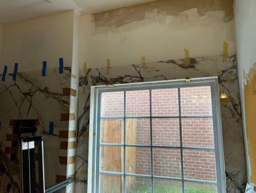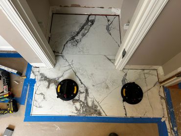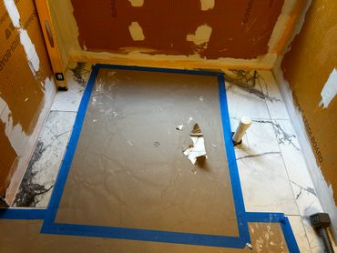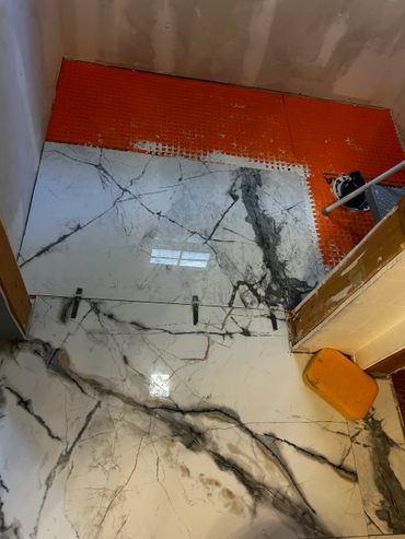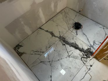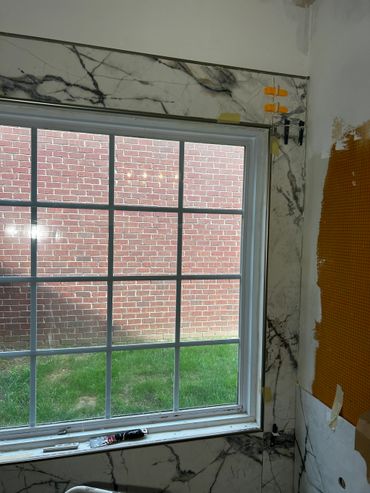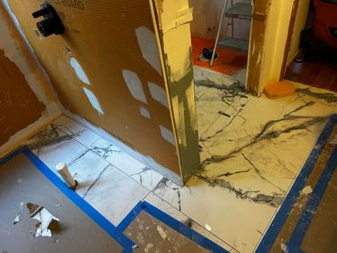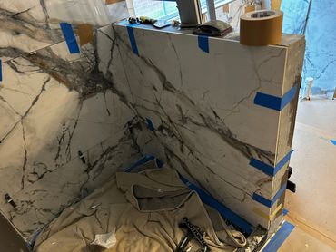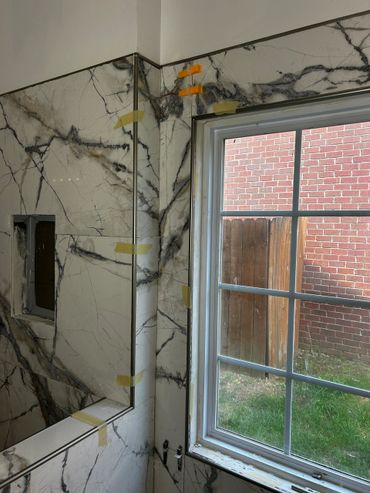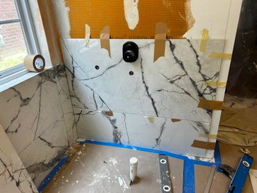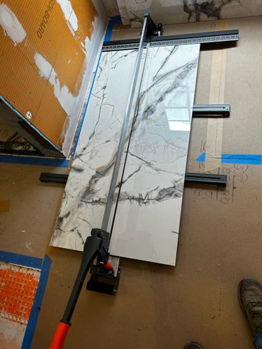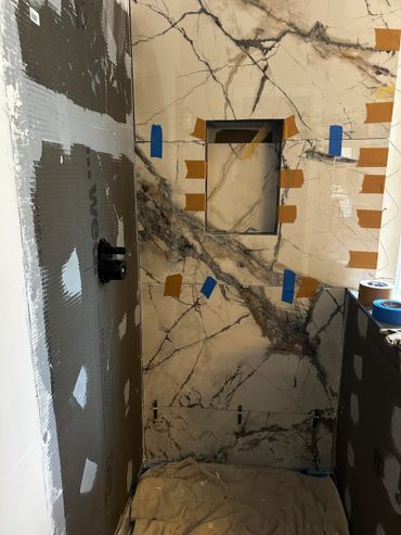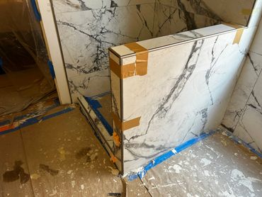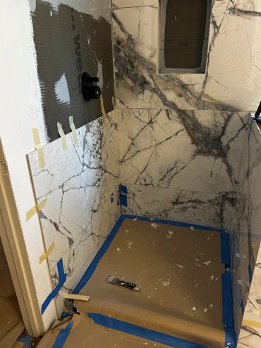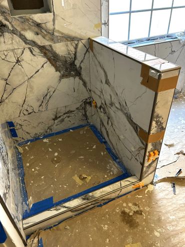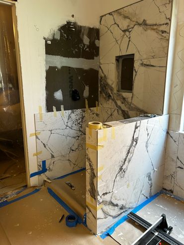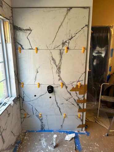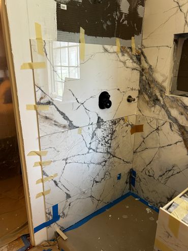 I spent the majority of last week continuing with the large format tile installation at my client Ricky's place. It's taking a little more time because Dan has been on a leave of absence, and I haven't been able to work on it every day. I managed to cut & set most of the tiles on the back, and inside pony wall with some remaining to do around the window. I then cut and placed some on the remaining walls, including other side of pony wall, then cut & drilled holes for the shower & tub valves. I will be setting these tiles next with thin set mortar, as well as the tiles around the window, remaining pony wall tiles, and then finally the shower niche.