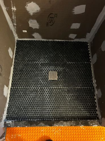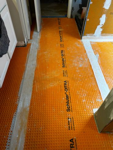 While Krys was painting, I was re-running the new drain for the freestanding tub that we're going to put in after the tile installation is complete at our client Ricky's house. Then our newest team member, "Hawaiian Dan, The Handyman" finished up with the waterproofing nearly the entire bathroom. Dan sealed the fasteners & joints on all the walls including both the Wedi walls, and Schluter System Kerdi Board walls around the tub. Then he sealed the Schluter-Ditra membrane on the floor as well.