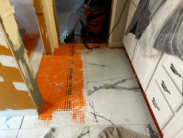 This past week "Hawaiian Dan, The Handyman" started laying the floor tile by installing mosaic tile in the shower pan . The homeowners Ricky & Darlene selected these luxurious glossy 2' x 4' porcelain tile with some great looking veining. Just before we hired Dan, he had planned to take some personal time off until the end of June, so I will be taking over the tile install.