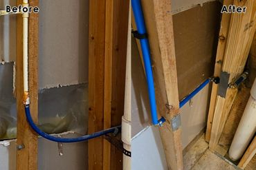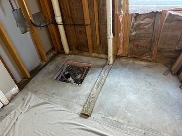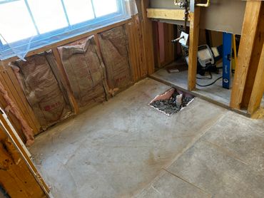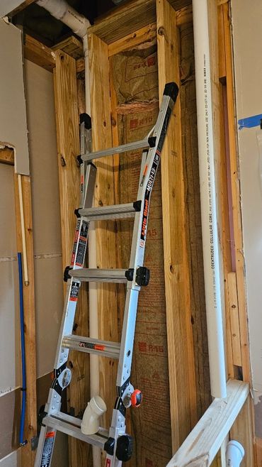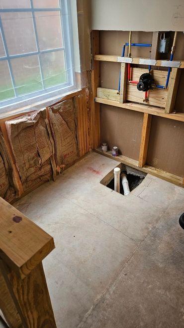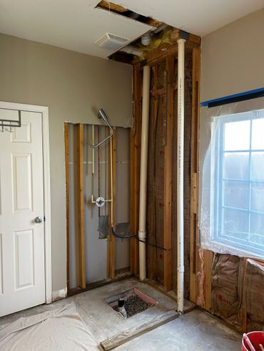 This was also the first week for my new team member to show his skill level in many areas including carpentry, drywall repair, and plumbing. Our new team member is named Danford (aka Dan), and he did an amazing job framing in the new 2" x 6" back shower wall, and re-running the plumbing for an outside hose spigot. He also framed in the new pony wall, which isn't complete yet, but we will complete that based on the finished depth of the new Wedi Systems shower pan. We also laid out the new location for the free standing tub drain, and will be re-running the drain plumbing next.