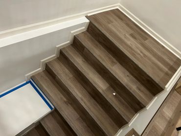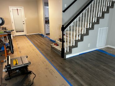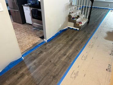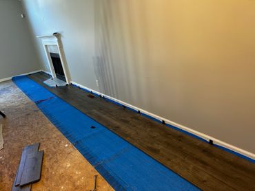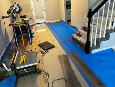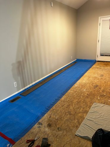 During this week I stayed a couple nights in Clarksville where I continued on with the new flooring project for friends Albert & Mary in their rental property. They opted for a high quality antimicrobial underlayment to detour moisture and to help prevent the growth mold which I had to treat in a few areas. Then I proceeded to lay down the new Mohawk PureTech (PVC free) laminate flooring. After I completed one long run of flooring, I then covered it with Ram Board floor protectant, and moved the tools over on to it. Cutting the flooring close to the work area helped with speed and efficiency.