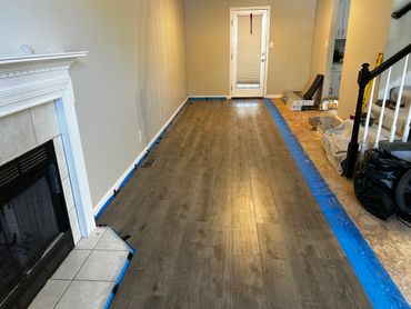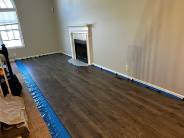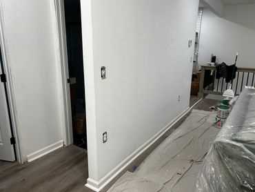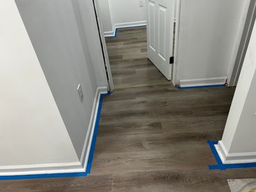 I returned to Albert & Mary's rental property in Clarksville at the end of the week to caulk the 1/4 round molding, fill the nail holes, mask the floor, and then paint the baseboard & the 1/4 round.