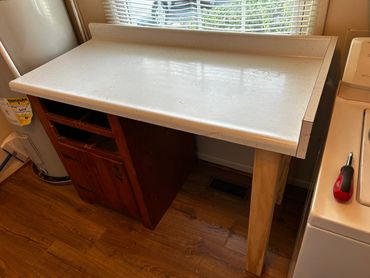 Earlier in the week a regular client of mine called me back to reattach a laminate top back onto an old cabinet that she uses in her laundry room. I also installed new sturdy table legs on the other end. I also sanded, primed, and painted her kitchen window sill that had sustain some minor water damage before she had her windows replaced.