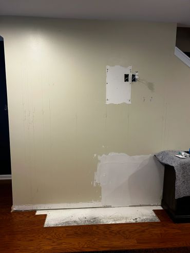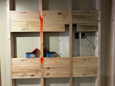 I also continued with the construction of a wall bump-out for my other client's new electric fireplace insert. I placed blocking behind the plywood for the future installation of her TV mount and wood mantle which will both be installed after the faux stone is installed over the plywood.
