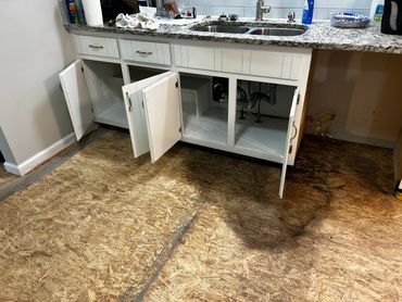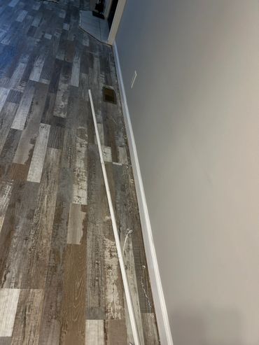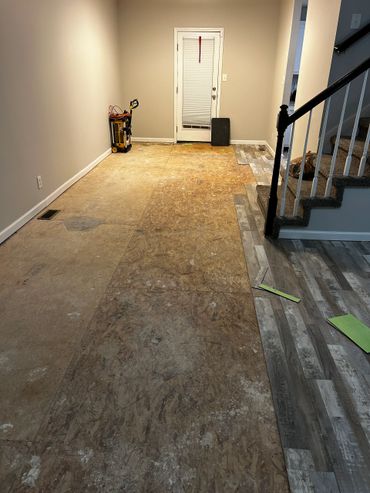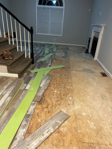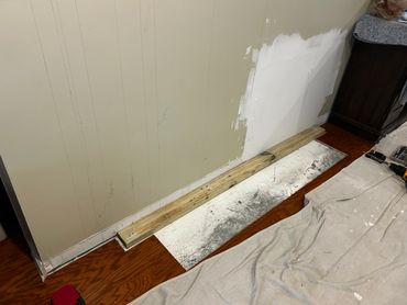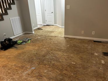 A couple new friends of mine, Albert & Mary, who also moved to Tennessee recently reached out to me about going up to Clarksville to look at a few small projects. New flooring, fence/gate repair, and a deck facelift. This is one of their rentals, and it was just vacated earlier this month. The new flooring is on order, so while we wait for it to arrive I started with the removal of all the 1/4 round shoe molding from all around the baseboards, and scraped off the old caulking. Then took up all of the old flooring on the first floor, and discovered some mold form an old leak. I cleaned, scrubbed, treated the mold using a microbial cleaner, and opened the windows to ventilate the house.
