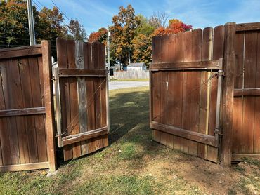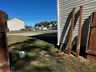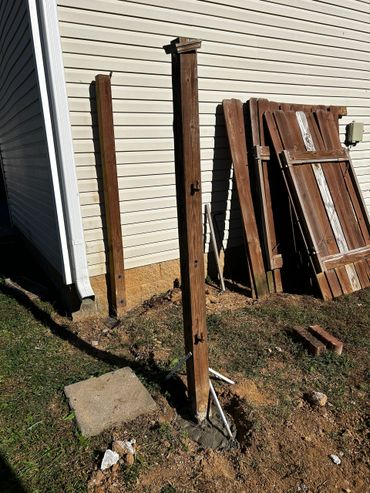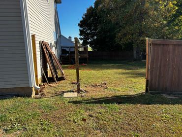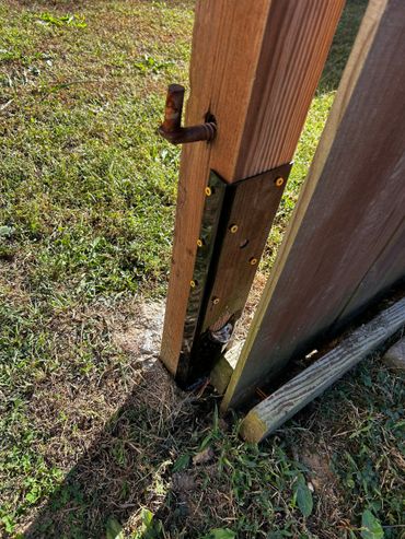 A section of their fence, and the gate had sustained damage from some heavy storms that came through Clarksville also. I dis-assemble the effected area, and re-set two posts. I bolted one post into the house using 6 inch concrete lag bolts to provide extra support for the one side of the gate. The post supporting the other side of the gate was a little loose, so I used a fence post mender (wedge) to stiffen it up.